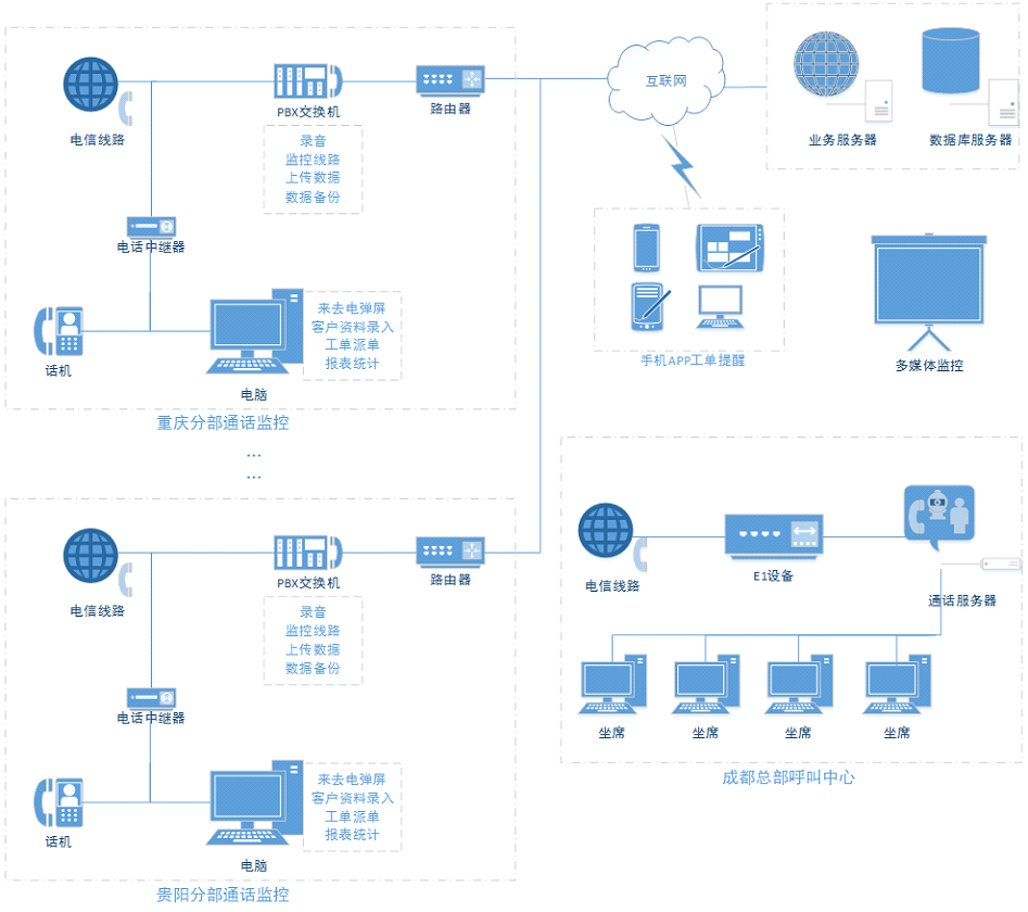- ∝语音外呼:总部实现批量群呼、一键拨号功能。具体实现问卷调查、电话回访和报表生成